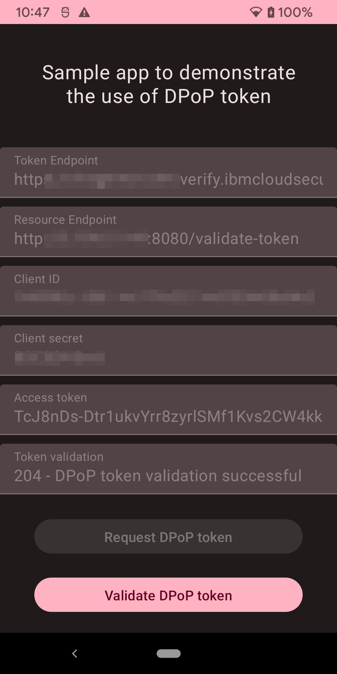 The mobile apps demonstrate how to obtain a DPoP token from IBM Security Verify and how that token is used in subsequent requests to the resource server.